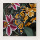 Eine lebendige Erholung mit Schmetterlingen auf farbenfrohen tropischen Blume mit einem ruhigen Strand und üppigen Palmen im Hintergrund. Die Szene erfasst das Wesen eines tropischen Paradieses mit hellen, exotischen Elementen.