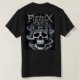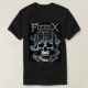 Ein monumentaler Schädel, der einer gotischen Kathedrale ähnelt, mit aufwändigen Rose und Bögen, die in die Schädelstruktur eingebaut sind. Der Nebel zieht sich aus den Augensockeln heraus. Oberhalb des Schädels wird das Wort "FizzelX" mit einem gotischen, gebrochenen Schriftart in uraltes, verwittertes Metall eingeprägt. Dunkel und majestätisch, was ein finsteres und kraftvolles Ambiente für ein Metall-T - Shirt-Design.