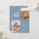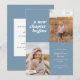 Diese Ankündigung des modernen Abschlusses enthält die Worte "ein neues Kapitel beginnt" oben links auf der Karte auf einem staubblauen Hintergrund. Es hat Räume für zwei vertikale Fotos, um die Reise Ihres Absolventen zu feiern, ein Foto aus der Vergangenheit und ein Foto aus der Gegenwart. Die Vorderseite der Karte hat Platz für den Namen des Absolventen, das Schuljahr, die Schule und zukünftige Pläne. Die Rückseite der Karte hat Platz für zusätzlichen Text und kann als Einladung für Graduiertengruppen oder zum Schreiben einer persönlichen Nachricht verwendet werden.