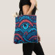 Ein psychedelisches, abstraktes Muster mit verschiedenen Augen, geometrischen Formen und aufwändigen Designs in Blau-, Rot- und Schwarztotentönen