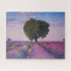 Dies ist ein schönes Bild eines bereits fertig gestellten Puzzles eines schönen Baumes und von Lavendelreihen. Die Puzzleteile passen nicht zum Bild, sodass es ein schwieriges Rätsel ist.