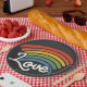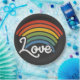 Ein Regenbogen der Liebe, dieses Design zeigt einen farbenfrohen Regenbogen mit dem Wort "Liebe".