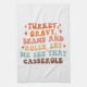 Dieses spielerische und lebendige Design ist perfekt für die Herbstsaison, besonders für den Erntedank, mit dem eingängigen und lustigen Satz "Türkei, Gravy, Bohnen und Rollen, Lass mir sehen, dass Casserole". Der Text ist in einem gestapelten Layout angeordnet, wobei jede Zeile eine andere Farbe hat als eine warme, Herbst inspiriert Palette. Die Farbtöne reichen von Orangen und Braun bis hin zu weichen Pinks, Blues und Gelb und spiegeln die gemütliche und festliche Atmosphäre der Herbsttage-Ansammlungen wider. Der stinkige Retro-Schriftart verleiht dem Design ein nostalgisches und skurriles Ambiente, während die sternähnlichen Glitzern, die über die gesamte Anlage verteilt sind, das feierliche Ambiente unterstreichen.