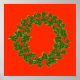 Common Holly Kranz Design - Kranz auf rotem Hintergrund. Ilex aquifolium, die heilige, gemeinsame heilige, englische Heilige, europäische Heilige, oder gelegentlich Weihnachten Heilige, ist eine Art blühender Pflanze in der Familie Aquifoliaceae. Dekoratives, festliches Design.