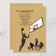 Eine sandfarbene Einladung mit Basketballspielern der Silhouette und einem Hoop. Der Front-Zahler springt hoch, um einen Slam-Dunk zu machen und trägt die Zahl, die sich auf das Alter des Jungen bezieht.Die Karte ist leicht anzupassen mit Ihrem Wortlaut, Schriftart, Schriftart Farbe und Auswahl von sechs Papiertypen.