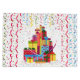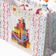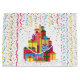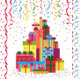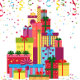 Ein Stapel farbenfroher Geschenkboxen mit Bändern und Bögen, Konfetti und Bänder, die von oben fallen, weißer Hintergrund, festliche und feierliche Atmosphäre, lebhafte Farben, Cartoon Stil.