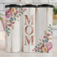 Diese grafische Abbildung, die als senkrechte Wandzeichen gestaltet wurde, enthält das Wort "MAMA" in großen, verblassten rosa Buchstaben in der Mitte. Der Hintergrund besteht aus hellen, rustikalen Holzplanken. Die Ober- und Unterseiten sind mit Aquarellbouquets verschiedener Blume in Rosa, Blau, Gelb und Rot dekoriert, was ein hübsches, zartes und charmantes Design schafft.