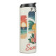 Diese Collage präsentiert ein erfrischendes Sommerthema, das sich um ein tropisches Getränk mit Ananas-Scheiben dreht. Der Hintergrund ist in vier Pools unterteilt, die klassische Szenen am Strand darstellen: ein goldener Sonnenuntergang, eine abstürzende Welle, ein Steg, ein Strand mit Palmen und einem Sonnenschirm. Die Kunst hat ein lebendiges, Vintages Aussehen mit einem gereizten Rahmen und den Worten "Sommerbewohner" am unteren Ende.