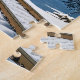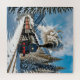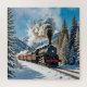 Eine Dampflokomotive durchquert eine schneebedeckte Berglandschaft und verlasst eine Spur bildenden Rauchs gegen einen klaren blauen Himmel. Die umliegenden Kiefernbäume sind schneebedeckt und bilden eine malerische Winterlandschaft.