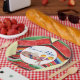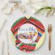Feiern Sie Cinco de Mayo mit diesen farbenfrohen Tellern. Der Hintergrund ist ein bunter Sarape. In der Mitte gibt es einen Sombrero und ein Paar Maracas.