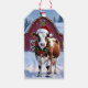 Weihnachtsgeschmack, saisonabhängig bis und von einem Geschenktag mit einer Abbildung einer festlichen Kuh in einer Weihnachtsmannmütze stehend vor einer herrlichen roten Scheune, die in Weihnachtsbeleuchtung dekoriert ist, und einem festlichen Kranz an einem schneebedeckten Wintertag. Die Rückseite ist ein Hintergrund oder rustikalen Stallholz.