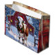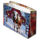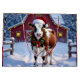 Weihnachtsgeschenktüte im Landhausstil mit einer Darstellung einer festlichen Kuh in einer Weihnachtsmannmütze, stehend vor einer prächtigen roten Scheune, die in Weihnachtsbeleuchtung dekoriert ist, und einem festlichen Kranz an einem schneebedeckten Wintertag. Die Rückseite ist ein Hintergrund oder rustikalen Stallholz.