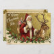 Diese Weihnachtskarte im Vintage-Stil zeigt eine klassische Illustration von Santa Claus, der in einer traditionellen, langen roten Robe mit weißem Pelzbesatz gekleidet ist und einen Sack voller Puppen und Spielzeuge über der Schulter trägt. Er steht neben einem großen Rentier und hält dessen Lederzaum vor einem texturierten, goldfarbenen Hintergrund. Die Szene wird am unteren Rand von festlichen Zweigen mit Stechpalmen mit roten Beeren und Mistelzweigen mit weißen Beeren gerahmt, während die Grußformel "A Happy Christmas Tide" in eleganter weißer Schrift oben links erscheint.