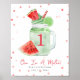 "eins in einer Melone" Thema 1. Geburtstag mit der Illustration einer Wassermelone Limone Smoothie in Mason Glas umgeben von Konfetti.