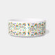 Eine Keramikschale, verziert mit einem farbenfrohen Muster aus Regenbögen, Federn und Punkten auf weißem Hintergrund. Das Design wirkt fröhlich und verspielt.