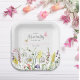 Ein kleiner Schmetterling, eine Blumenduschplatte. Niedliche, individuell gestaltbare Teller aus Gartenpapier sorgen für ein angenehmes Ambiente in der Frühling-, Sommer- oder Naturdusche. Elegante Schrift und moderne Schriftart. Geeignet für die Dusche eines kleinen Mädchens. Weitere Babyduschvorräte für Schmetterlinge und Wildblumen finden Sie in der Whimsical Butterfly Wildblume Baby Shower Collection im Shop The Ansammlung Designs.