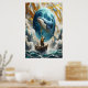 Ein surreales Gemälde, das einen Fischer in einem kleinen Boot darstellt und in einem riesigen blauen Wal, der mit einem wirbelnden blauen Orb verbunden ist, reist, vor einem Hintergrund von goldenen Wolken und dramatischen Wellen.
