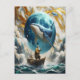 Ein surreales Gemälde, das einen Fischer in einem kleinen Boot darstellt und in einem riesigen blauen Wal, der mit einem wirbelnden blauen Orb verbunden ist, reist, vor einem Hintergrund von goldenen Wolken und dramatischen Wellen.