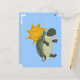 Eine Schildkröte genießt an einem warmen Tag eine Eistüte im Mixed Media Image auf dieser Postkarte. Die grüne Schildkröte sitzt aufrecht und die Beine sind ausgestreckt. Er hält einen Waffelkonus mit Eis, der mit bunten Sprinklen bedeckt ist. Das Lächeln auf seinem Gesicht, während er die gefrorene Leckerei leckt, zeigt seine Zufriedenheit. Ein blauer Schmetterling hat auf seiner Muschel angezündet und auf beiden scheint eine lächelnde Sonne. Aus meinem digital erstellten Original-Bild.