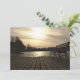 Eine Einladung mit einer Holzbank auf dem Holzsteg mit Sonnenuntergang im Hintergrund