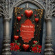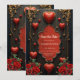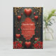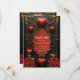 Eine Touch der Gotik, des Herzens und der ewigen Verbindung. Das Design zeichnet sich durch ein dunkles, elegantes Hintergrunddesign aus, das sofort Aufmerksamkeit zeichne. Mehrere leuchtend rote Herzen, von denen einige scheinbar in Tartrops verwandelt wurden, hängen von zarten, dünnen Saiten und verleihen der Karte eine spielerische und romantische Touch. Das Zentrum wird von einem kunstvoll gestalteten, roten Rahmen dominiert, der mit einer zarten Rose, die Liebe und Leidenschaft symbolisiert, dekoriert ist. Am unteren Ende der Karte schmücken üppige rote Rosen mit üppiger Vegetation das romantische Ambiente.