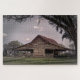 Eine landschaftliche Darstellung einer verwitterten Holzhütte, umgeben von üppigem Gras und einer üppigen Eiche, die ein Vintages Landschaftsbild zeigt.