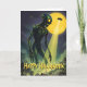 Halloween-Karte mit einem Alien-Invader, der den Planeten übernimmt und die Stadt verscheucht. Ein Raumschiff strahlt einen Lichtstrahl von geheimnisvollem Licht auf die Stadt ab. Fügen Sie Ihre Nachricht im selben gruseligen Schriftart hinzu.