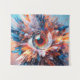 Eine lebendige und surreale Darstellung konzentriert sich auf ein hochdetailliertes Auge, umgeben von einer Explosion abstrakter und farbenfroher Elemente. Die Komposition besteht aus einer Mischung aus Federn, Bio Formen und nach außen strahlenden Farbenstößen, die eine dynamische und faszinierende Szene schaffen. Digitale Kunstfotografie CS5