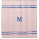 Dieser blassrosa Duschvorhang hat zwei tiefe blaue horizontale Linien, die oben und unten liegen. Ein tiefblauer Brief ist in der Mitte. Sie können den Buchstaben ändern, um das richtige Monogramm anzuzeigen.