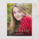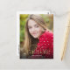 Diese minimalistische Abschluss-Postkarte zeichnet sich durch trendige Typografie und ein großes Foto aus. An der Vorderseite wird "Graduate" in Goldschrift mit einem großen blühte geschrieben. Das Abschluss Jahr wird in den blüh gesetzt, und der Name und die Schule des Absolventen sind unten. Das Typografiedesign überlagert ein großes vertikales Foto. Auf der Rückseite der Abiturpostkarte können Sie eine Nachricht an Empfänger und/oder Graduiertengruppe Informationen hinzufügen.