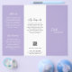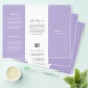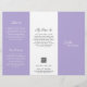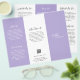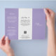 Moderner und beruflicher lila / lavender Trifold Broschüre Flyer mit einem einfachen und minimalen Design mit Ihrem Namen in einem eleganten Drehbuch und zeitgenössischen Sans Serif Schriftart. Die Vorlage enthält mehrere geteilte Bereiche für Ihre Dienste in einem minimalistischen Layout. Der Rücken hat Ihre Kontaktdaten und optionalen QR-Code. Wenn Sie es vorziehen, kann der QR-Code im Entwurfstool entfernt werden. Im Inneren finden Sie Abschnitte für Firmeninformationen und eine Preisliste.