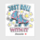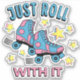 Retrostil-Illustration mit "Just Roll With It" Textdesign und farbenfrohen Sternen und Skate-Dekoration