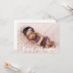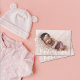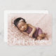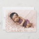Eine einfache, moderne Geburtsankündigung mit dem Namen eines Säuglings in weißem Text auf der Vorderseite und der Geburtsinformation auf der Rückseite.