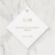 Einfache Gastgeschenk Hochzeit Tag mit elegantem und zeitlosem Design mit zwei Buchstaben Monogramm, Namen und Hochzeitstermin. Alle Designelemente sind in Imitaten goldfarben auf weißem Hintergrund und können im Designbearbeitungstool geändert werden. Ein gepflegtes und klassisches Design, das sich perfekt für ein Paar eignet, das traditionell Stil will und Tags mit moderner Touch bevorzugt.