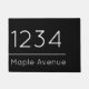 Diese schwarze Tür hat weißen Text, den Sie bearbeiten können, um Ihre Straßenadresse anzuzeigen. Die Ziffern für Ihre Hausnummer liegen über einer horizontalen Linie und der Text für Ihren Straßennamen.