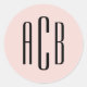 Moderne dreitellige Monogramm-Konstruktion in schwarz auf massiv blass rosa Rundaufklebern. Ein minimalistischer Stil hochglänzender Schriftart 3 Erstdesign funktioniert für ein Hochzeitsmonogramm oder für eine Einzelperson. Passen Sie die Größe, Farbe oder Platzierung des Schriftartes an.