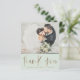 Diese elegante und zeitgenössische Dankeschön-Karte bietet eine große, elegante Kalligraphie in einem luxuriösen Imitat Goldblatteffekt auf einem sanften grünen Hintergrund, mit Platz für fünf Ihrer Lieblings-Hochzeitsfeier-Fotos. Dieses stilvolle, zweiseitige Design eignet sich perfekt, um Ihren besonderen Tag mit Freunden und Familie zu teilen und dabei herzliche Dankbarkeit zu äußern. Personalisieren Sie sich einfach mit Ihren eigenen Bildern und Nachrichten, um einen wirklich einzigartigen Sake zu schaffen. Ideal für Braut und Bräutigam Dankkarten, Post-Hochzeit-Foto Schreibwaren, oder maßgeschneiderte Hochzeit Foto danke Ihnen Notizen.