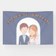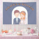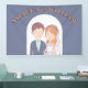 Dieses Hochzeitsbanner zeigt eine bezaubernde Abbildung einer Braut und eines Bräutigams. Der Bräutigam ist mit kurzem braunem Haar, einem hellen Teint dargestellt und trägt eine marineblaue Anzug-Jacke über einem hellblauen Shirt und einer weißen Krawatte. Er hat einen kleinen Boutonniere, der auf seinen Laptop fixiert ist. Die Braut ist neben ihm stehend und lächelt süß. Sie hat schwere, rötlich-orangefarbene Haare mit einer Blume aus rosa, orangefarbenen und weißen Blüten. Hinter ihr fließt ein zarter weißer Schleier. Sie trägt ein weißes Hochzeitskleid mit einem süßen Halsband und einer Perlenhalskette. Diese einfache, Cartoon-ähnliche Abbildung weist auf eine String-liebende Verbindung zwischen ihnen hin. Es ist skurril und liebenswert und setzt einen fröhlichen Ton für die kommende Hochzeit.