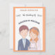 Die Einladung zur Hochzeit zeigt eine bezaubernde Abbildung einer Braut und eines Bräutigams. Der Bräutigam ist mit kurzem braunem Haar, einem hellen Teint dargestellt und trägt eine marineblaue Anzug-Jacke über einem hellblauen Shirt und einer weißen Krawatte. Er hat einen kleinen Boutonniere, der auf seinen Laptop fixiert ist. Die Braut ist neben ihm stehend und lächelt süß. Sie hat schwere, rötlich-orangefarbene Haare mit einer Blume aus rosa, orangefarbenen und weißen Blüten. Hinter ihr fließt ein zarter weißer Schleier. Sie trägt ein weißes Hochzeitskleid mit einem süßen Halsband und einer Perlenhalskette. Diese einfache, Cartoon-ähnliche Abbildung weist auf eine String-liebende Verbindung zwischen ihnen hin. Es ist skurril und liebenswert und setzt einen fröhlichen Ton für die kommende Hochzeit. Der Einladungstext wird so minimalistisch wie möglich behalten für ein einfaches Gefühl, bei dem Liebe das einzige wichtige Element ist! Alle Felder sind vollständig anpassbar. Sie können die Felder, die Sie nicht gewollt haben (z.B. die uAwg, wenn Sie eine separate Karte bevorzugen), leeren. Orange Hintergrund.