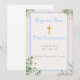 Diese Einladungskarte für eine Erste Heilige Kommunion ist ein besonderes Dokument, das die religiöse Zeremonie der ersten Gemeinschaft eines Jungen ankündigt. Sie ist mit religiösen Symbolen wie Kreuz, Blume und Blattwerk geschmückt. Anpassen und ändern Sie es nach Ihren Wünschen.