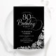 Einfache elegante 80. Geburtstagsfeier in Schwarz und Silber. Klassisches Design mit Rose, Imitaten Silberfolie und Typografie Script Schriftart. Die trendige Einladungskarte eignet sich perfekt für eine stilvolle Damenfeier. Personalisieren Sie Ihre persönlichen Daten. Kann für jedes Alter angepasst werden. Gedruckte Zazzle-Einladungen oder Sofortdownload digitaler Druckvorlage.