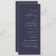 Dieses einfache, elegante Hochzeitsprogramm zeigt weißen Text, der auf einem dunkelmarineblau blauen Hintergrund am rechten Rand ausgerichtet ist. Das Wort "Hochzeit" erscheint in weißer handgeschriebener Kalligrafie, der Rest in Serif und kursiven Schriftart.