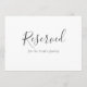 Als einfaches, vorbehaltenes Zeichen für Hochzeiten oder andere Veranstaltungen hat diese Flachkarte "reserviert" in einem handgeschriebenen Schriftart mit einem kleineren Text, der angibt, für wen der Sitzplatz oder der Tisch reserviert ist. Sie können diese Karte nach Belieben personalisieren. Der Text wird sowohl auf der Vorder- als auch auf der Rückseite der Karte angezeigt.