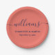 Personalisierte, staubblaue Hochzeitspapier-Teller mit einem modernen Script-Schriftart. Einfach mit Ihren Hochzeitsdetails online personalisieren. Die passenden Produkte ergänzen diese minimalistischen, aber eleganten, staubblauen Hochzeitszettel-Teller.