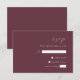 Diese einfache, elegante Hochzeitskarte bietet weißen Text, der auf einem dunkelburgundischen Hintergrund mit dem rechten Rand ausgerichtet ist. Die Buchstaben "uAwg" erscheinen in kalligrafischer Schrift, mit anpassbarem kursiven Text und Leerzeichen für die Antworten der Gäste unten. Die Rückseite der Karte ist fest bordeauxrot.