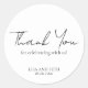 Klassische Schwarz-Weiß-Hochzeitsaufkleber mit einem schlichten Design und einer modernen, minimalistischen Touch. Die Worte "Danke" im Titel "Danke, dass du mit uns gefeiert hast" sind in einer eleganten Schriftzeichen und der Rest ist in einem klassischen Serif-Schriftart.
