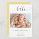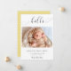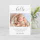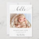 "Hello" im eleganten Script-Schriftart mit extravaganten Swashes. Eine einfache und elegante Ankündigung der Geburt eines Fotos. Modernes, minimalistisches und sauberes Aussehen. Die Rückseite hat ein niedliches Polka-Punktmuster.