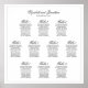 Fügen Sie Ihrem Hochzeitsempfang Schönheit und Anmut mit unserem eleganten 10-Tisch-Sitzplan hinzu. Das schlichte, aber zeitlose Schwarz-Weiß-Design beinhaltet extravagante Schriftzeichen für die Namen und Tischnummern des Paares. Mit einer Kapazität von bis zu 100 Gästen mit 10 Sitzplätzen pro Tisch wird diese Tabelle es Ihren Gästen erleichtern, ihre Sitzplätze zu finden, während sie Ihrem Event eine raffinierte Note verleihen.