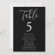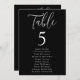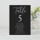 Modernes Hochzeitssitzdiagramm mit "Table", das in einem weißen Skript mit der unten abgebildeten Tischnummer und den Namen der Gäste auf schwarzem Hintergrund angezeigt wird. Das Design wiederholt sich auf der Rückseite. Um das Sitzdiagramm der Tischnummer zu bestellen, editieren Sie jede Karte mit der Tischnummer und den Namen der Gäste und fügen Sie es Ihrem Warenkorb hinzu. Entworfen, um mit unserer Simple Script Hochzeitskollektion zu koordinieren.