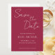 Einfache Hochzeit im Stile rette den aktuellen Einladungen, die mit einem weißen, stilisierten Skript auf einem trendigen, weinroten Hintergrund versehen sind. Bearbeiten und ersetzen Sie Namen, Datum und Position mit Ihrem eigenen. Wählen Sie Ihre Einladungsgröße und Ihren Papierstil aus.